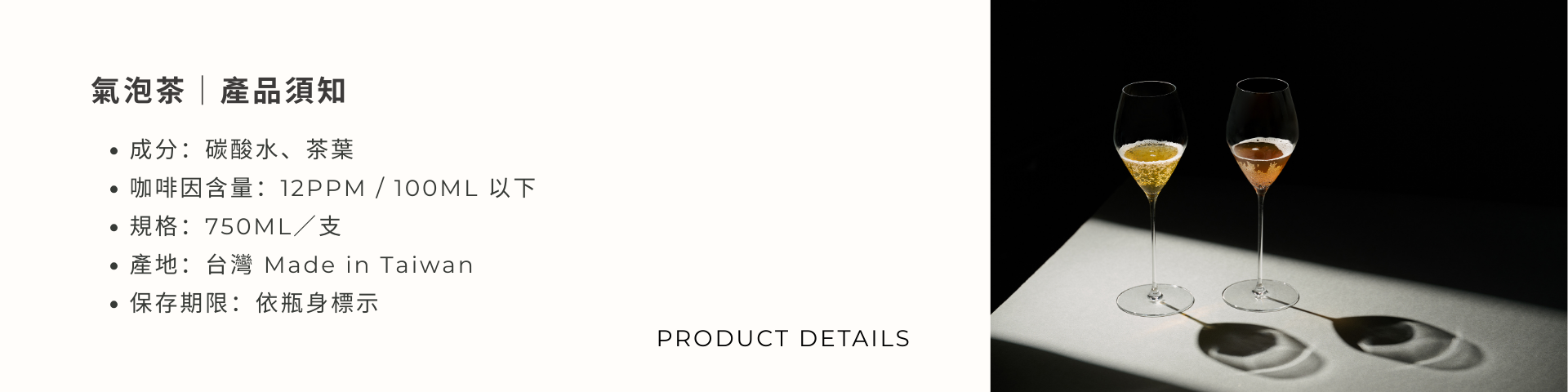「白翡」氣泡茶正是以這樣的風味靈感出發。我們選用大吉嶺莊園紅茶「月漾 Moon Drop」,這款茶本身帶有青麝香葡萄香與白毫般的柔滑口感。茶葉在高山冷霧中自然發酵,形成類似 Pinot Meunier 的酸香結構與粉嫩氣質。透過高壓灌入二氧化碳的工藝,細膩氣泡在茶湯間遊走,使香氣層次更立體、氣泡壽命更悠長,宛如一杯會呼吸的香檳。